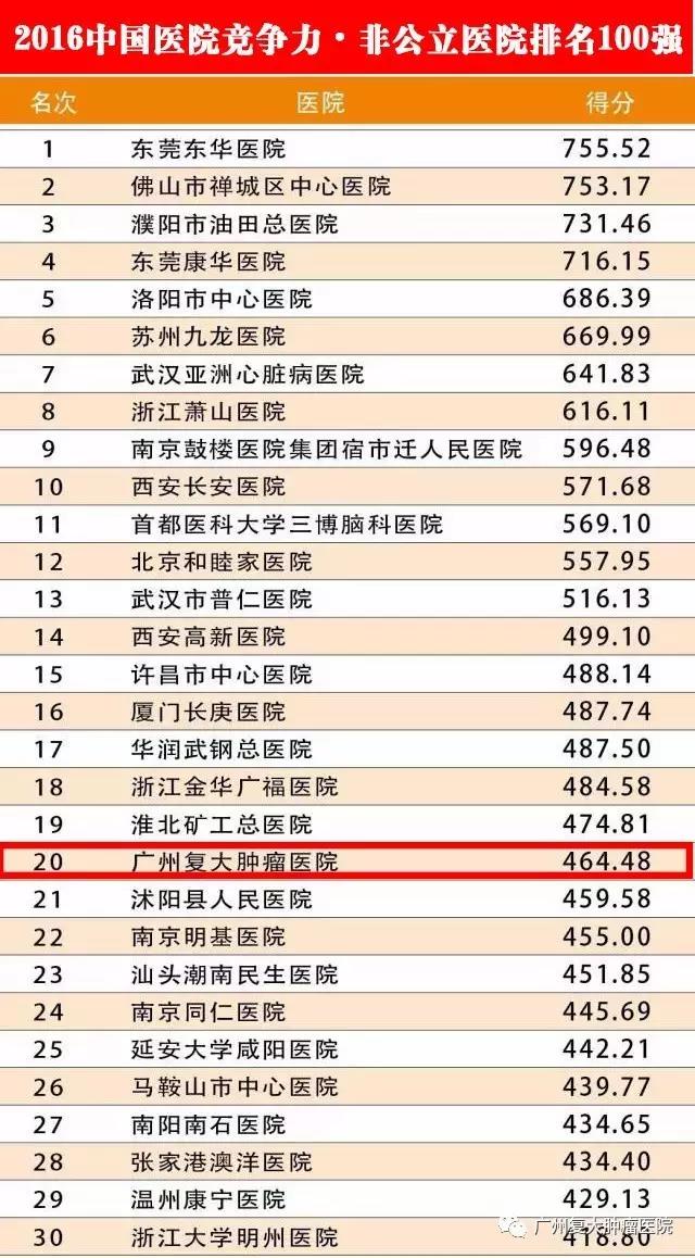在“2016中國(guó)醫(yī)院競(jìng)爭(zhēng)力•非公立醫(yī)院100強(qiáng)”榜單中,廣州復(fù)大腫瘤醫(yī)院躋身20強(qiáng),與去年的榜單相比,躍升了九位。