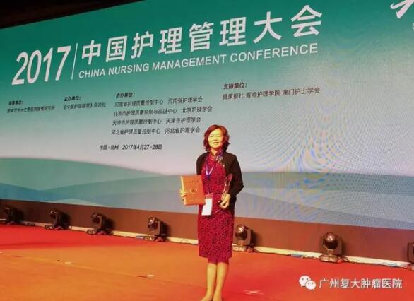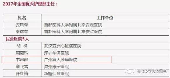 ↑ 廣州復(fù)大腫瘤醫(yī)院護理部主任韋昌群榮獲“全國優(yōu)秀護理部主任”稱號。在104位“全國優(yōu)秀護理部主任”獲獎?wù)咧?,來自民營醫(yī)院的只有五位,而韋昌群就是其中之一。
