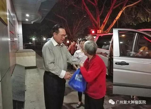 ↑ 晚上7點(diǎn)30分,經(jīng)過四個(gè)多小時(shí)的車程,滿載患者和家屬的中巴車到達(dá)廣州復(fù)大腫瘤醫(yī)院海珠院區(qū)。徐克成總院長與一眾醫(yī)護(hù)人員早已在醫(yī)院等候患者家屬。