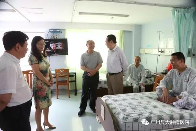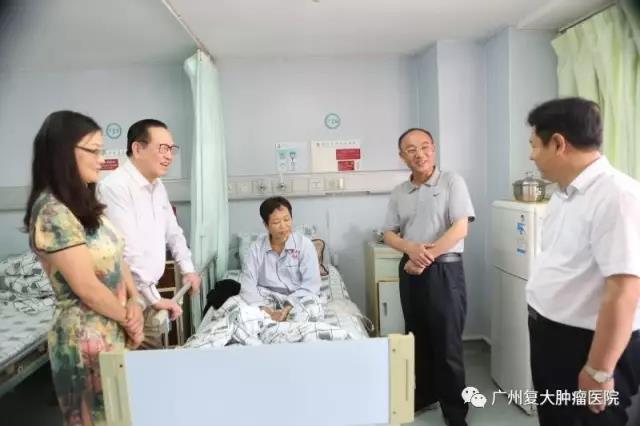 2017年5月16日,廣東省扶貧辦主任梁健、廣東省紅十字會副會長甘萍來到廣州復(fù)大腫瘤醫(yī)院海珠院區(qū)看望來自廣東廉江、興寧、揭西的貧困病人。廣州復(fù)大腫瘤醫(yī)院總院長徐克成、總經(jīng)理劉建國陪同探望。