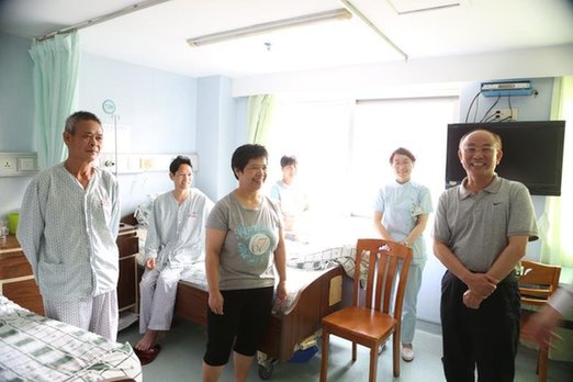 梁健一走進七樓病房,就受到患者及家屬們的熱烈歡迎。梁健用客家話與患者們打招呼,一下拉近了與大家的距離。