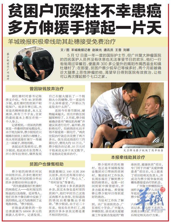 今年5月,在羊城晚報報業(yè)集團的積極牽線和推動下,蔡少銳得到了由廣東省扶貧辦、廣東省紅十字會、廣州復(fù)大腫瘤醫(yī)院、徐克成關(guān)愛健康工作室聯(lián)合發(fā)起的“精準扶貧、健康扶貧”項目——復(fù)大博愛基金“關(guān)愛腫瘤患者”項目的幫扶,廣州復(fù)大腫瘤醫(yī)院專程將其接到廣州治療。歷經(jīng)60多天的住院治療后,8月2日他順利手術(shù),目前正在恢復(fù)中。