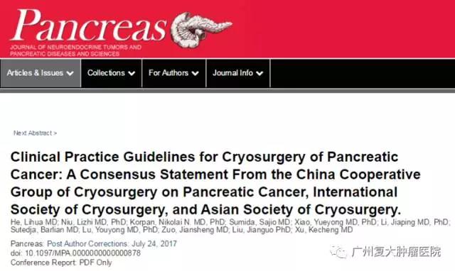 暨南大學附屬廣州復大腫瘤醫(yī)院院長牛立志博士的科研團隊針對局部晚期胰腺癌的治療方法,主筆撰寫了“胰腺癌的冷凍手術臨床實踐指南”,于2017年7月24日正式發(fā)表于美國胰腺癌領域權威學術期刊Pancreas(中文譯名“胰腺”)。