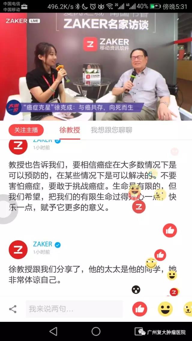 2017年8月11日下午,時(shí)代楷模、白求恩獎(jiǎng)?wù)芦@得者、暨南大學(xué)附屬?gòu)V州復(fù)大腫瘤醫(yī)院總院長(zhǎng)徐克成教授做客南國(guó)書香節(jié),在國(guó)內(nèi)最受歡迎的互聯(lián)網(wǎng)資訊閱讀平臺(tái)ZAKER的“名家訪談直播間”與廣大網(wǎng)友面對(duì)面交流。現(xiàn)場(chǎng)講解《與癌共存》、《我對(duì)癌癥患者講實(shí)話》等著作內(nèi)容,并與網(wǎng)友探討如何看待癌癥發(fā)生等問題,直播有近1萬(wàn)多網(wǎng)友在線聆聽。