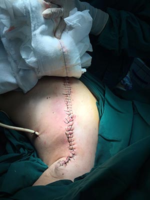 王建南教授在22日為其進行手術(shù)治療,術(shù)前準備左大腿皮膚消毒,移皮。術(shù)中發(fā)現(xiàn)腫塊基底部并不寬大,與一枚鴿蛋樣大小淋巴結(jié)相連,腋窩淋巴結(jié)三枚腫大。手術(shù)切除包括部分胸大肌在內(nèi)的標準改2式根治,獲得滿意的根治性效果。