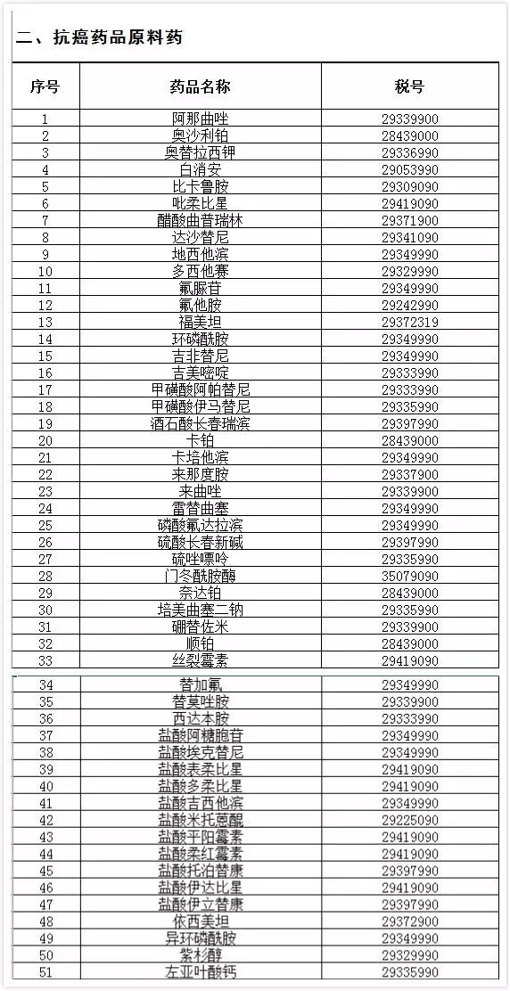4月28日,財(cái)政部、海關(guān)總署、稅務(wù)總局、國家藥品監(jiān)督管理局發(fā)布通知,明確規(guī)定自5月1日起,對進(jìn)口抗癌藥品,減按3%征收進(jìn)口環(huán)節(jié)增值稅。同時(shí),公布了相關(guān)藥品清單。