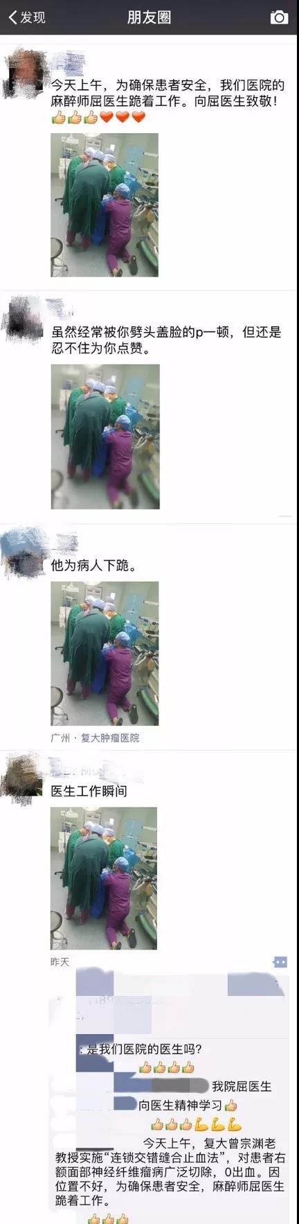 麻醉科同事告訴筆者,當(dāng)時屈微主動上前幫忙,這幾天他剛好腿不好,后來得知他竟然跪在地上挺感動的,確實很敬業(yè)?!?/p>